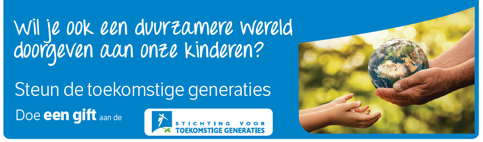 Dit kan ook via het rekeningnummer IBAN BE 98 5230 4030 5393 - BIC: TRIOBEBB op naam van de Stichting voor Toekomstige Generaties.